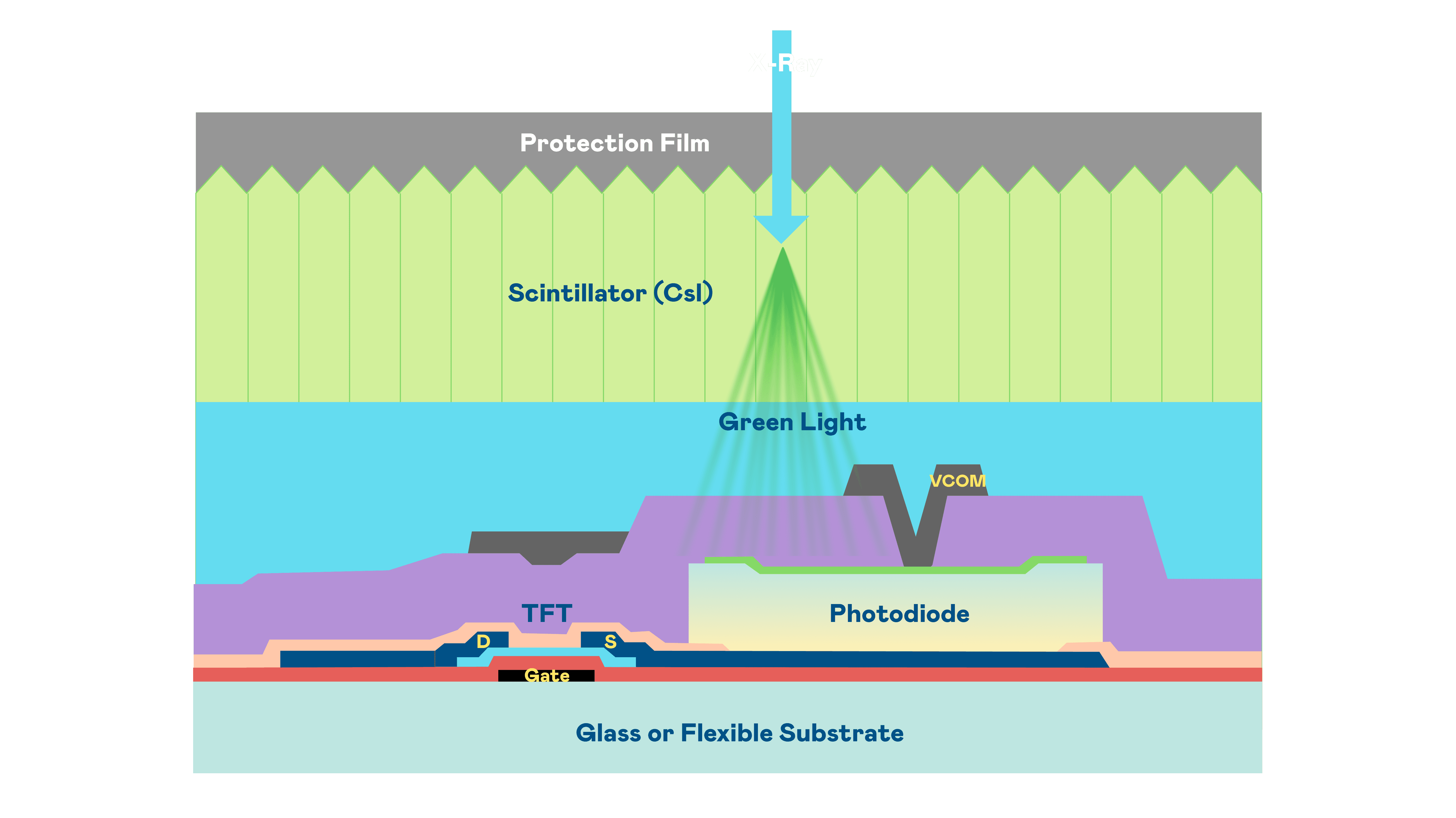 尊龙集团的X光影像感测阵列使用薄膜电晶体 (TFT) 作为每个像素的读取开关,,搭配光电二极体(Photodiode)的光电转换元件,,,用以感测X光影像讯号。。。。
